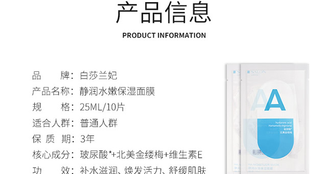 白莎兰妃静润水嫩保湿面膜贴片 玻尿酸补水面膜